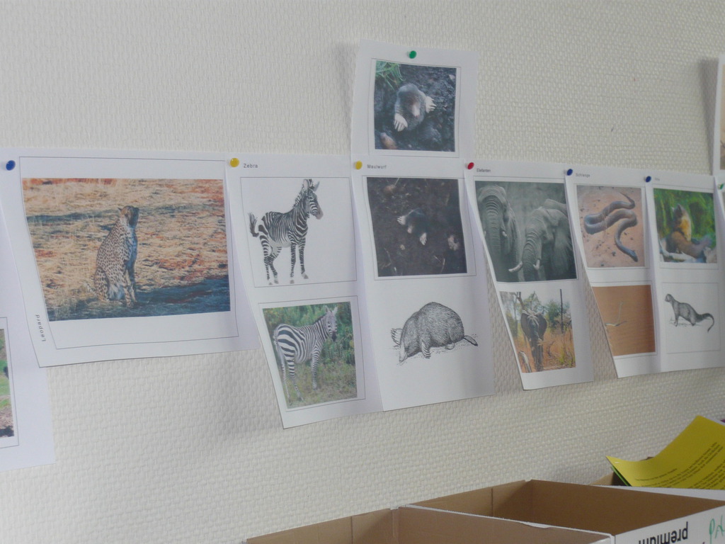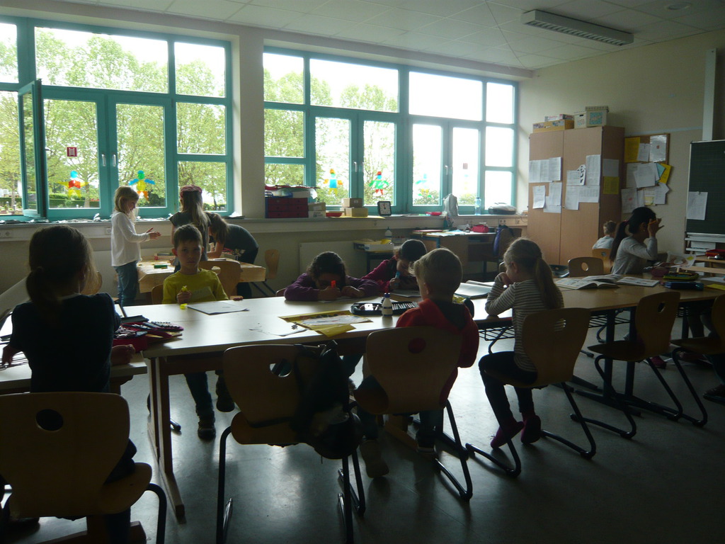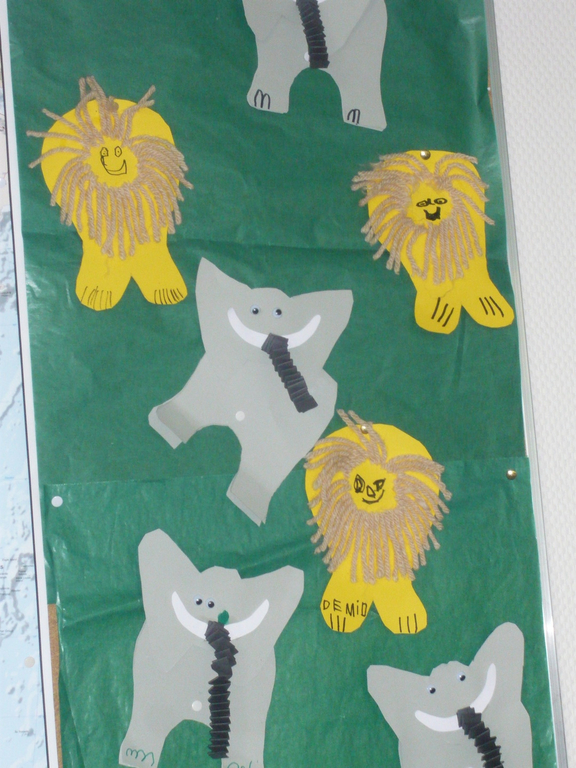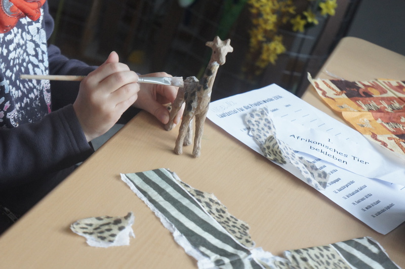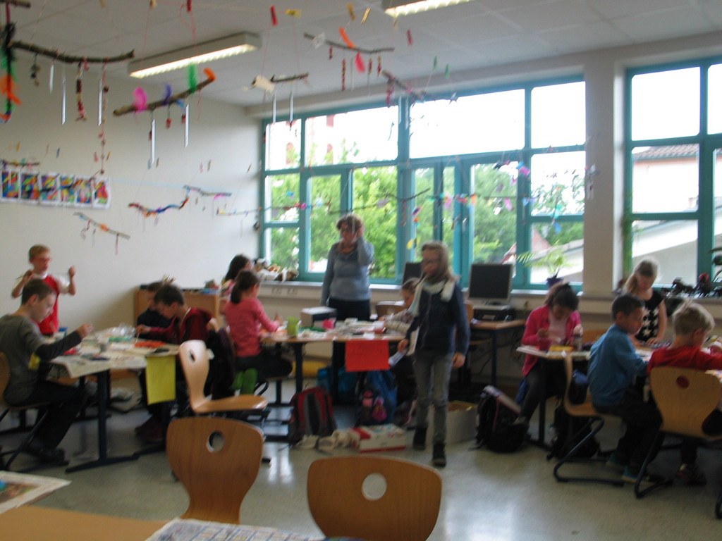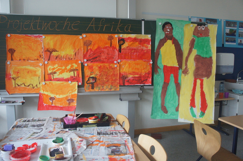 Wir sahen im Raum viele Bilder, Giraffen, Zebras, Leoparden und Rasseln. Nebenan haben die Kinder Umrisse mit einem Partner gemacht und danach mit Afrikanischen Kleidern und Schmuck beklebt und bemalt. Sie haben die bemalten Menschen auf ein großes Plakat geklebt. Die Lehrerin hat uns erzählt, dass sie dieses Projekt gewählt hat, weil die Kinder hier eine große Auswahl haben. Anastasia hat uns berichtet, dass sie dieses Projekt aus dem Grund, dass man hier basteln kann, gewählt hat. Milena findet dieses Projekt schön, weil man hier viel mit Händen basteln kann. Hennes findet das Projekt toll, weil man hier Tiere aus Afrika und Rasseln aus Afrika basteln kann.