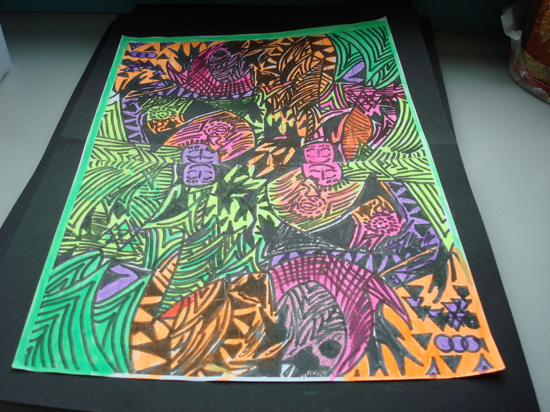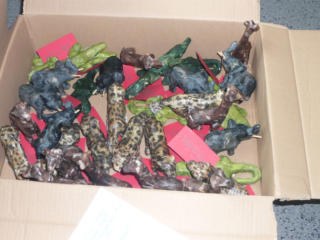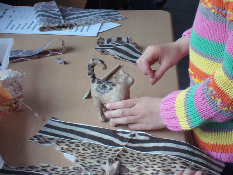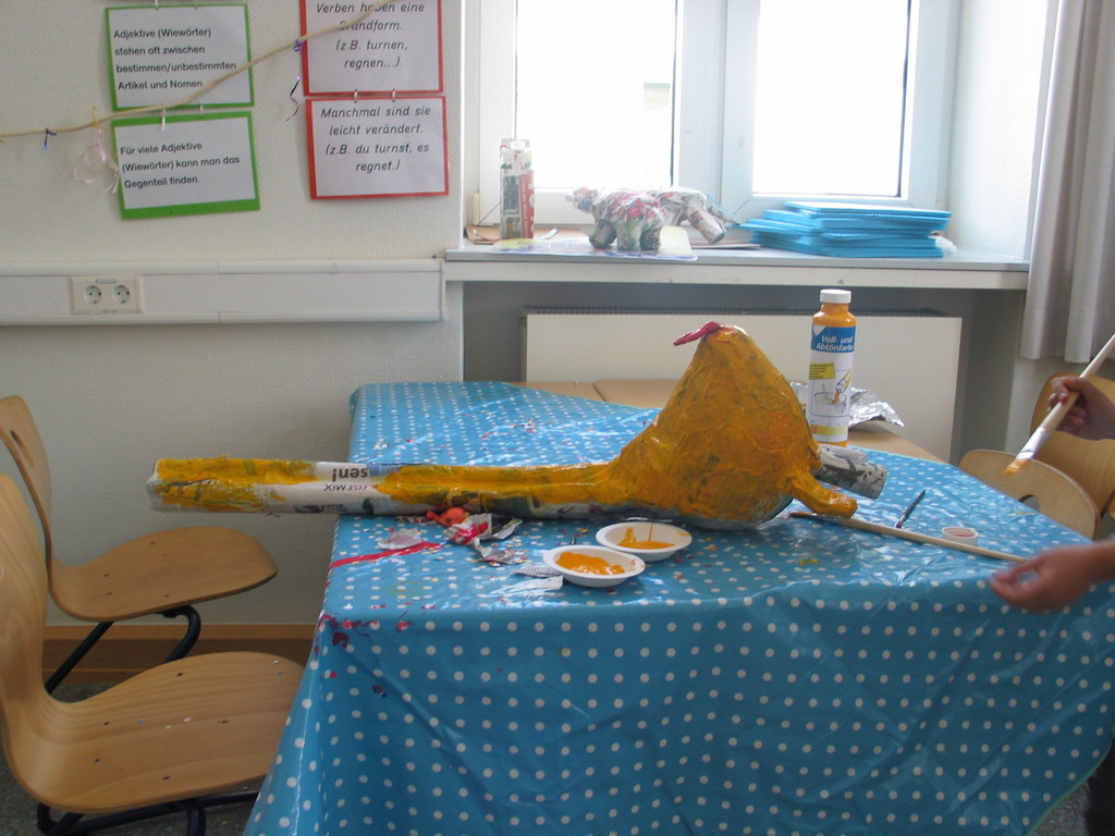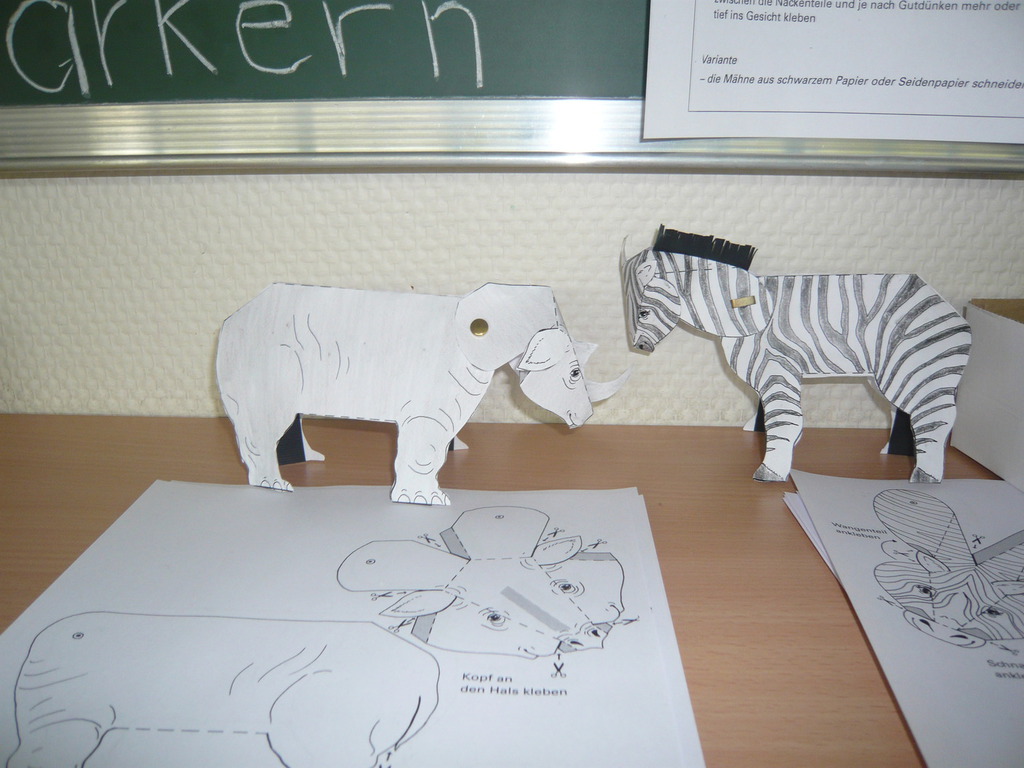 Wir sahen im Raum viele Bilder, Giraffen, Zebras, Leoparden und Rasseln. Nebenan haben die Kinder Umrisse mit einem Partner gemacht und danach mit Afrikanischen Kleidern und Schmuck beklebt und bemalt. Sie haben die bemalten Menschen auf ein großes Plakat geklebt. Die Lehrerin hat uns erzählt, dass sie dieses Projekt gewählt hat, weil die Kinder hier eine große Auswahl haben. Anastasia hat uns berichtet, dass sie dieses Projekt aus dem Grund, dass man hier basteln kann, gewählt hat. Milena findet dieses Projekt schön, weil man hier viel mit Händen basteln kann. Hennes findet das Projekt toll, weil man hier Tiere aus Afrika und Rasseln aus Afrika basteln kann.