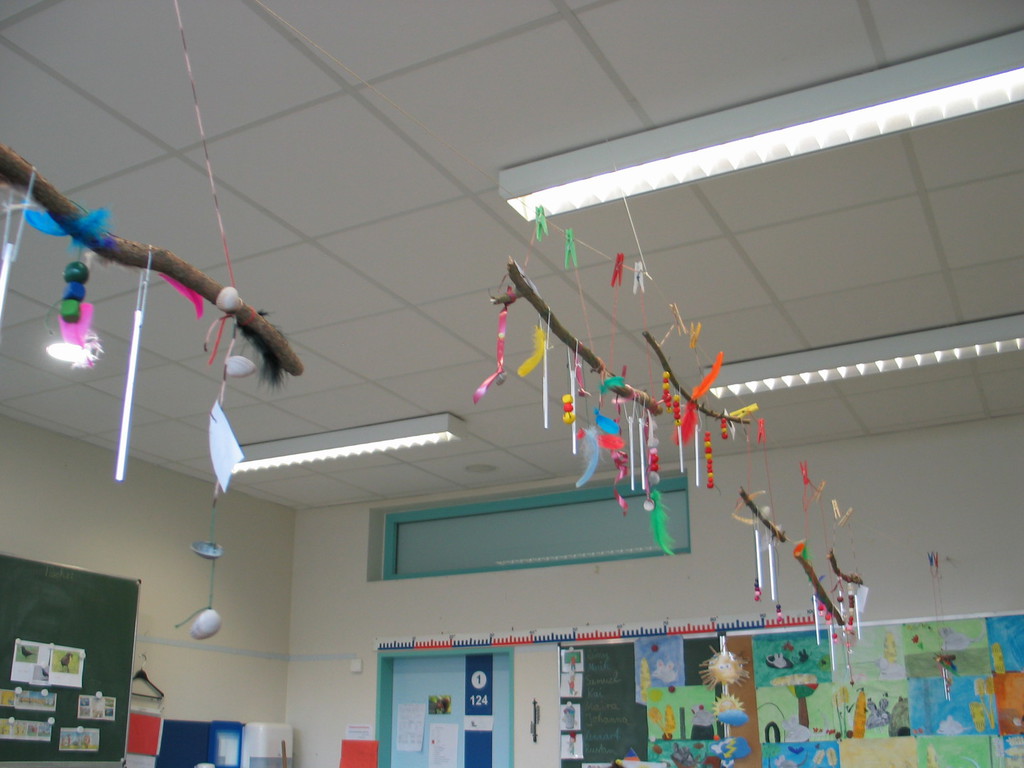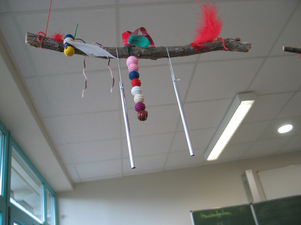 An der Decke hängen schöne Windspiele und bunt angemalte Bilder.