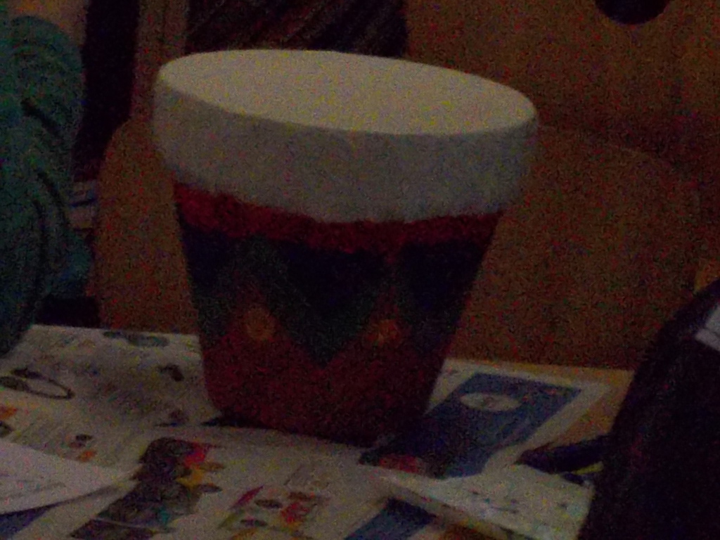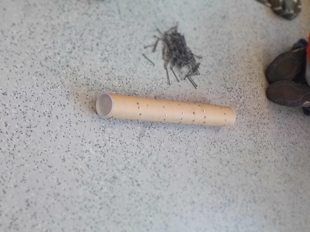 "Es geht ganz einfach. Zuerst schlägst du Nägel in eine Papprolle(Egal ob Klopapier- oder Küchen-Rolle). Dann steckst du an eine Seite einen Deckel. In die andere Seite schüttest du Reis. Nun musst du einen anderen Deckel auf die Seite stecken wo du den Reis herein geschüttet hast."