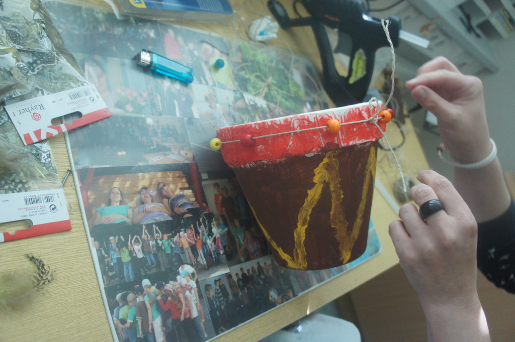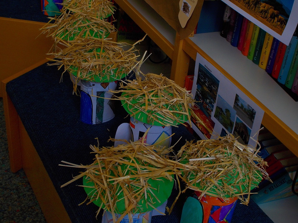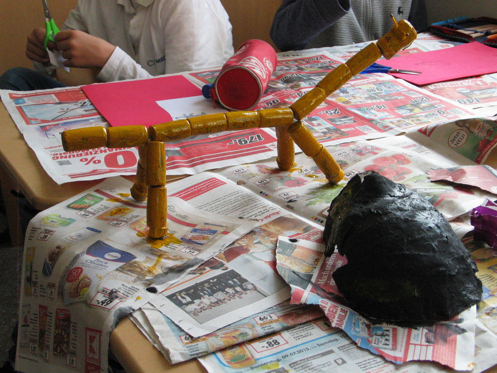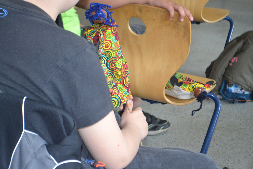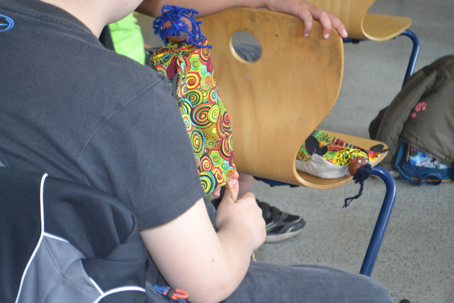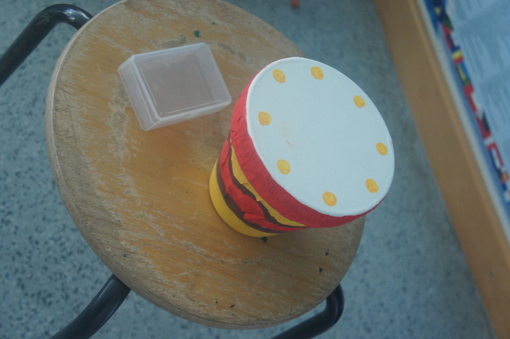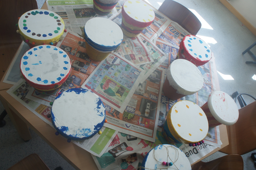 Es gab zwei Räume in diesem Projekt. Einmal den Musik Raum. Ich sah im Musikraum 35 Kinder in einem großen Stuhlkreis. Manche mussten auch auf einem Tisch sitzen, weil da viel zu viele Kinder waren. Sie sangen ein afrikanisches Lied. Es war sehr laut. In der Mitte war eine Schlange aus 6 Leuten. Sie liefen im Kreis am Rand herum. Ich habe gesehen wie die eine Hälfte des Kreises auf einer Trommel spielte, die selbst gebastelt wurde. Es gab aber auch selbstgemachte Rasseln, die bestanden aus einem kurzen Draht, einem Stock und ca. 7 Kronkorkenl. Im anderen Raum haben die Kinder die Trommeln gebastelt. Nur es war leider der letzte Tag und niemand hat mehr gebastelt. Die Leiterin des Projekts hat uns erzählt, dass sie dieses Projekt gewählt hat, weil sie den anderen Kinder gerne hilft. Julian hat dieses Projekt gewählt, weil er gerne bastelt.