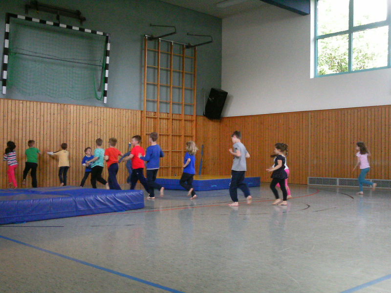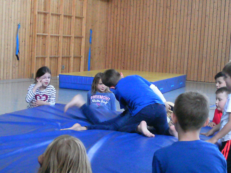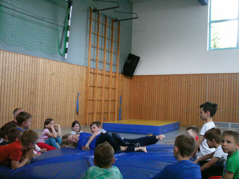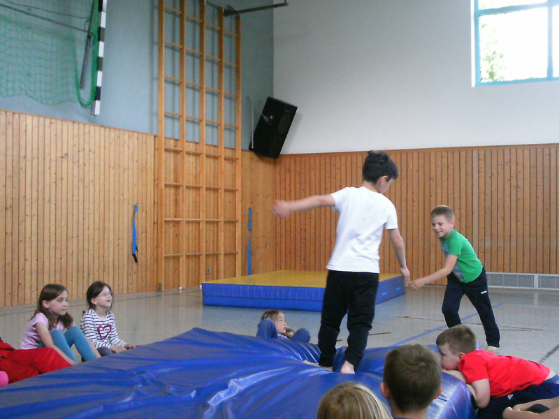 Herr Görner: Wir haben haben Fortschritte gemacht. Uns sind Ideen für Spiele eingefallen. Aber wir können jetzt auch besser balancieren. Aus Flaschen haben wir ein Spiel gemacht mit dem man Steine balancieren kann. Jetzt machen wir Ringkampf. Wir passen auf unsere Gegner trotzdem auf.