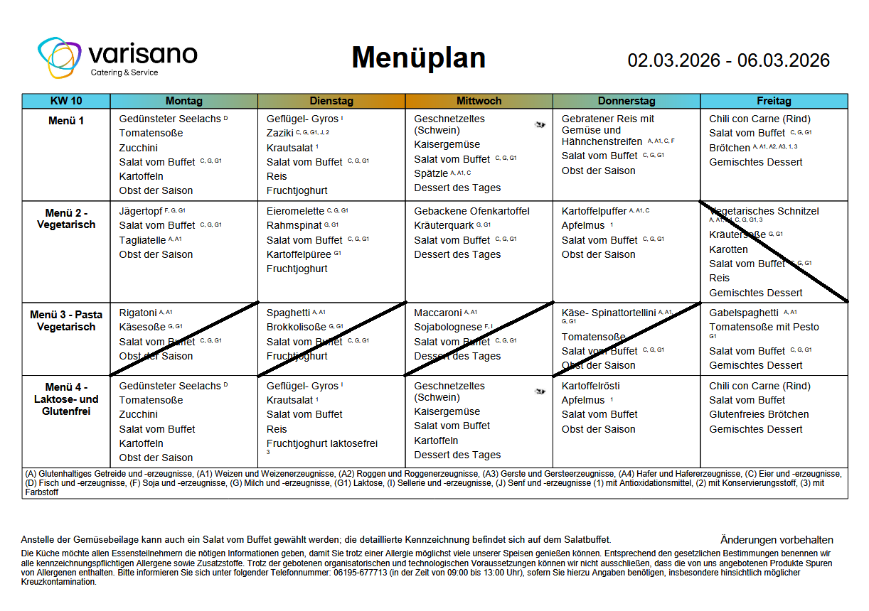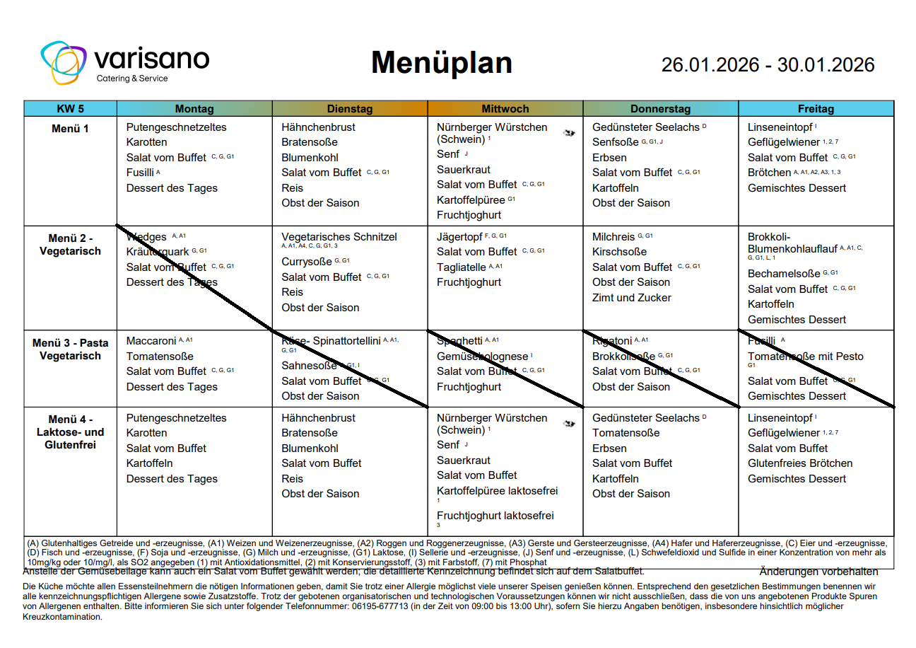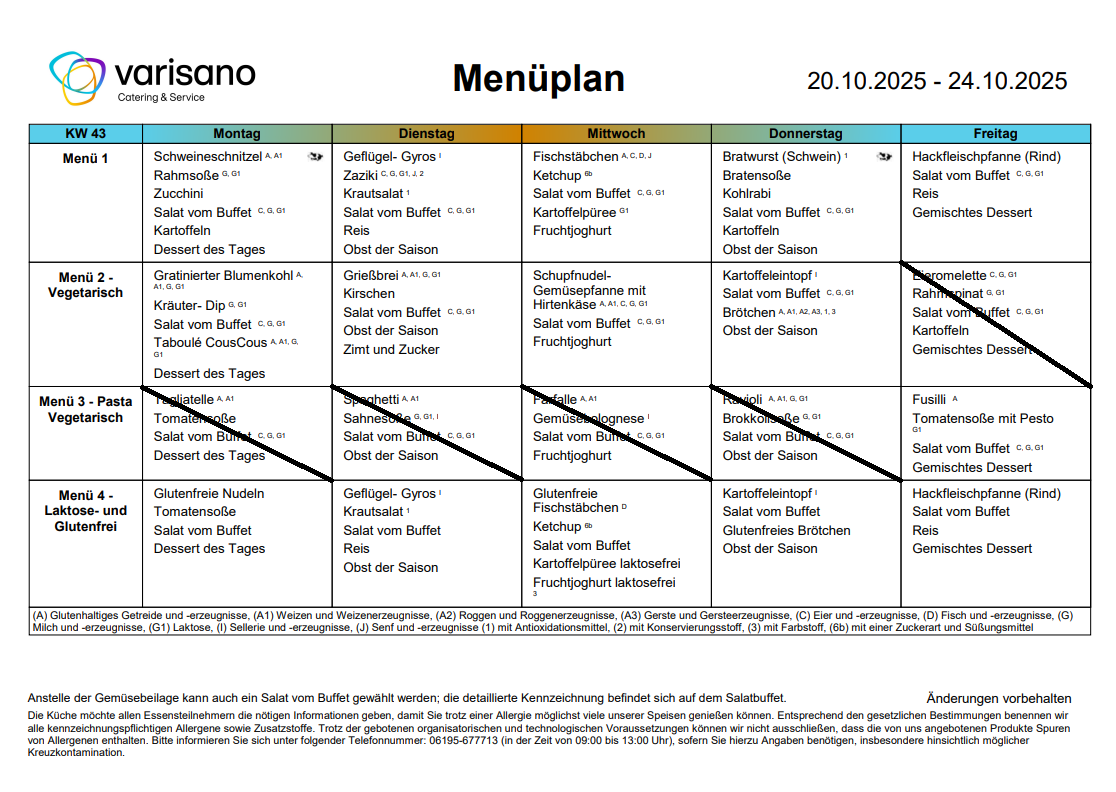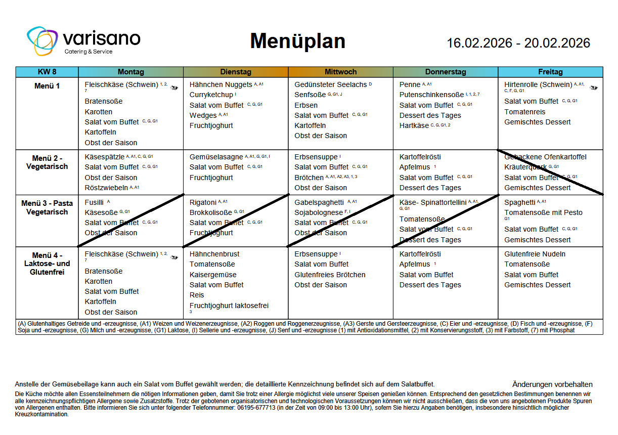 der Umfrage senden wir den entsprechenden Speiseplan des Caterers. Darin sind Allergene und Zusatzstoffe aufgeführt. Die Speisepläne stehen zusätzlich weiter unten auf dieser