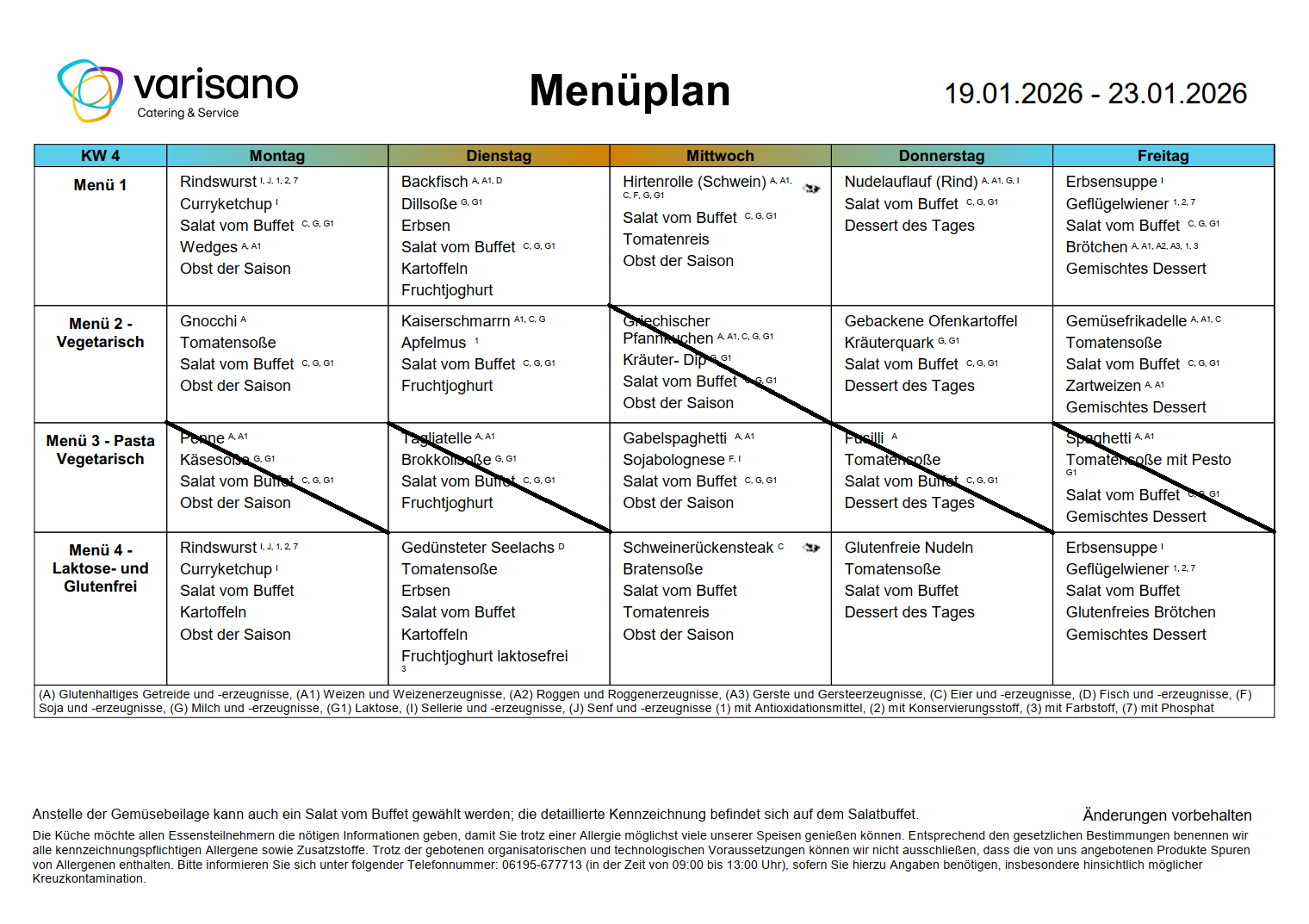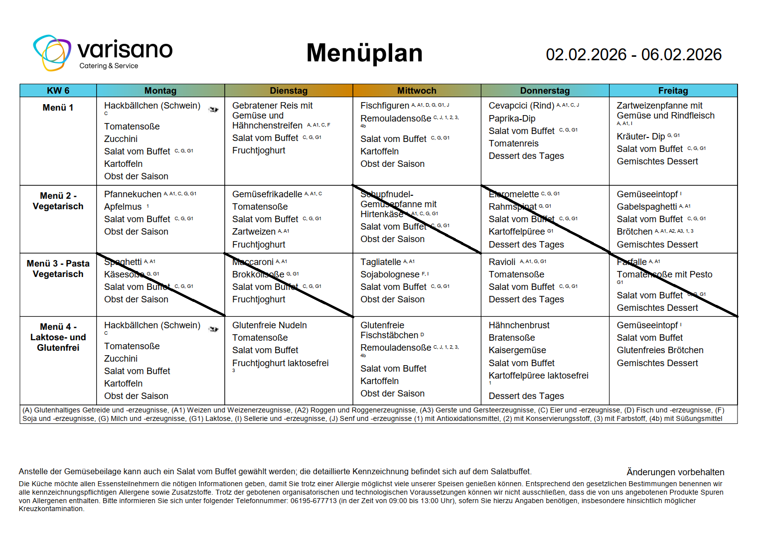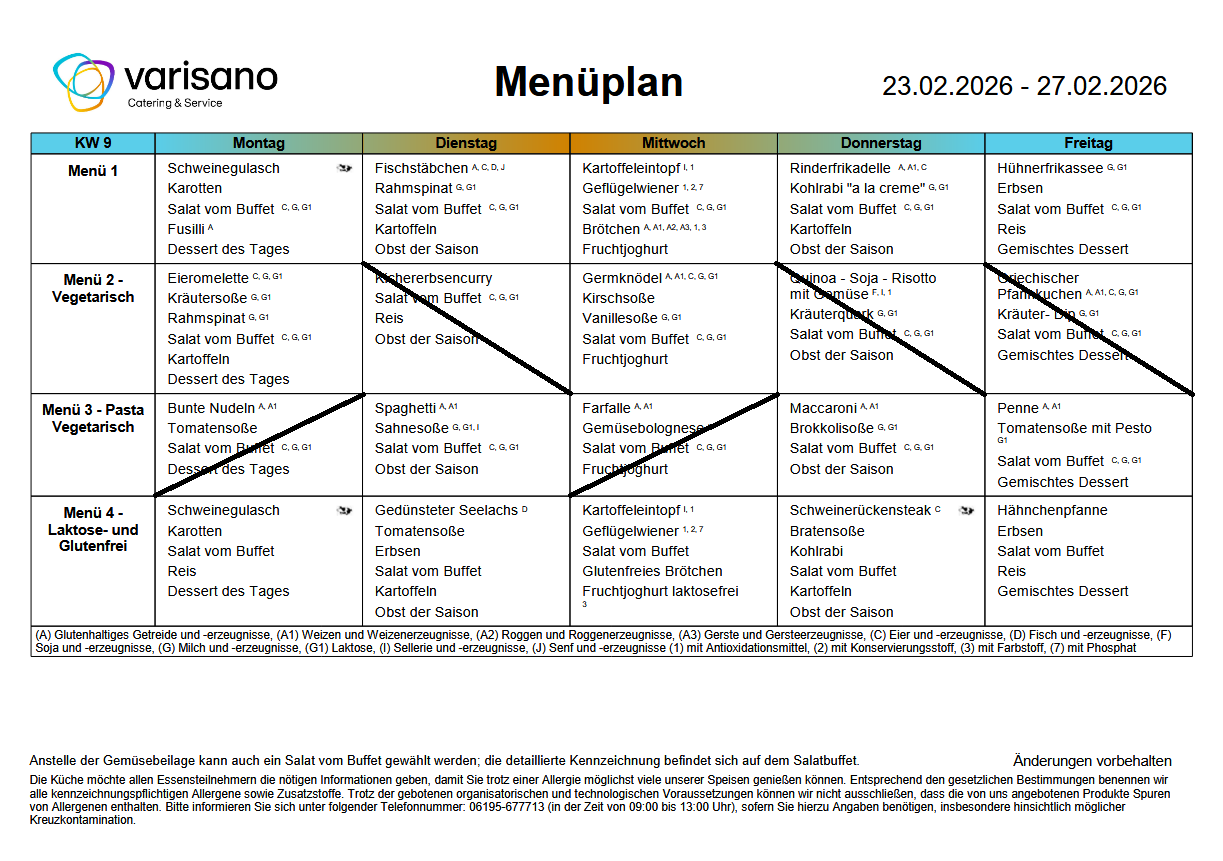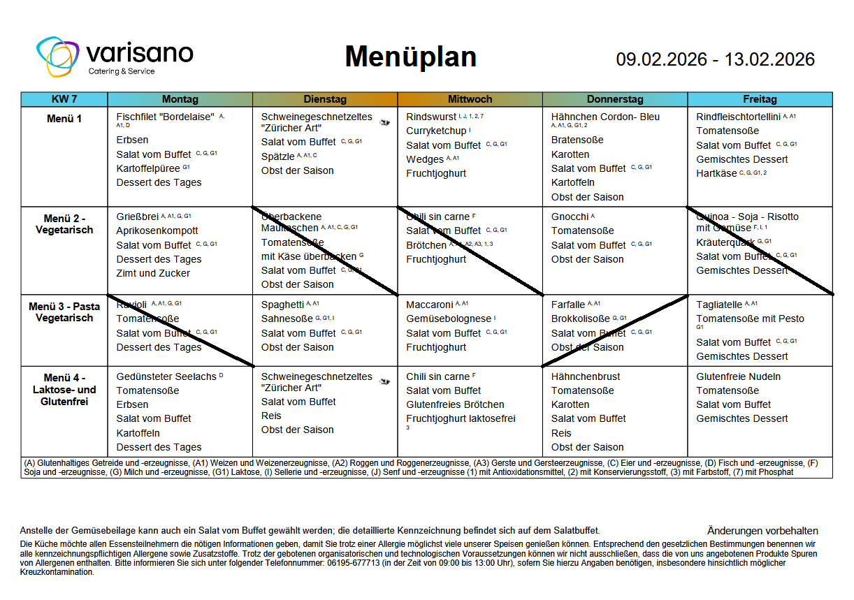 der Umfrage senden wir den entsprechenden Speiseplan des Caterers. Darin sind Allergene und Zusatzstoffe aufgeführt. Die Speisepläne stehen zusätzlich weiter unten auf dieser