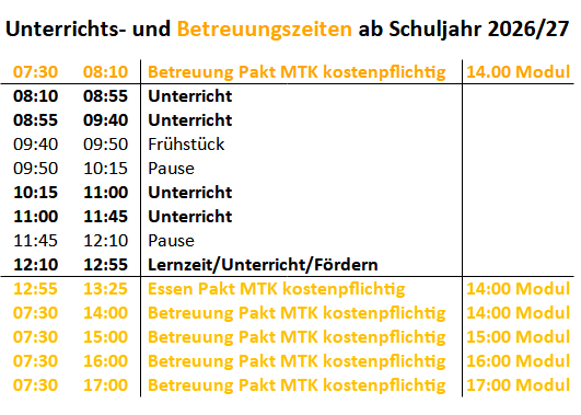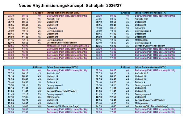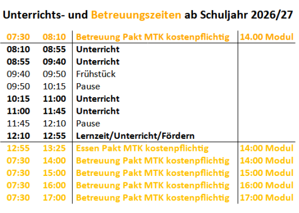 AB DEM SCHULJAHR 2026/2027 WERDEN SICH DIE UNTERRICHTS- UND BETREUUNGSZEITEN FÜR DIE NEUEN ERSTKLÄSSLER ÄNDERN.